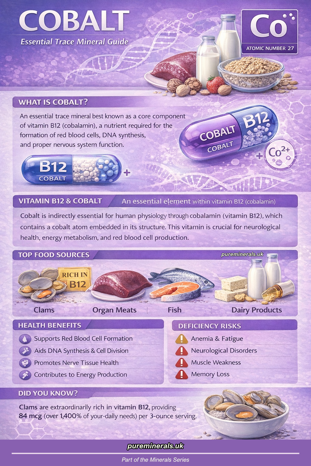 Cobalt is an essential trace mineral, best known as a core component of vitamin B12 (cobalamin), a nutrient required for the formation of red blood cells, DNA synthesis, and proper nervous system function. In plant-based foods, cobalt appears in small ionic forms, while its biologically active role occurs primarily through B12 in the human diet.